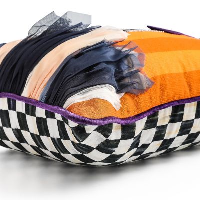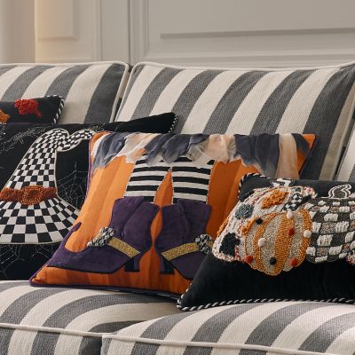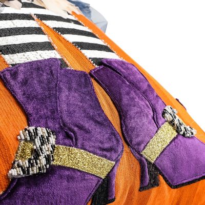 This simply spook-tacular machine-embroidered pillow features appliqued velvet boots and a layered tulle skirt. It’s embellished with shimmering threads and beads and finished with purple velvet piping. Courtly Check® fabric is on the back.