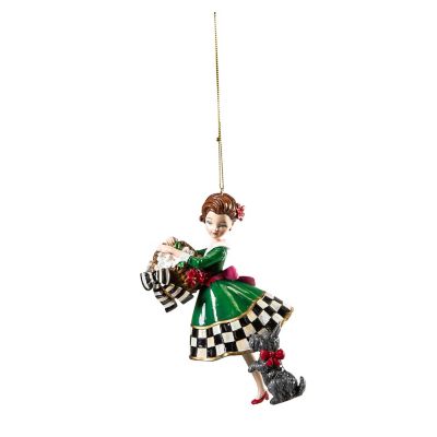 Trim the tree with an ornament featuring a retro-style girl, dressed in red and green with Courtly accents, holding a basket of flowers with a Scottie dog at her heels.
