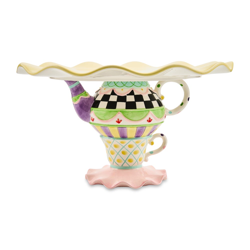 Serve up your favorite sweets with this charming ceramic Wonderland Cake Stand. Features various playful patterns on a kettle and teacup-shaped base.
