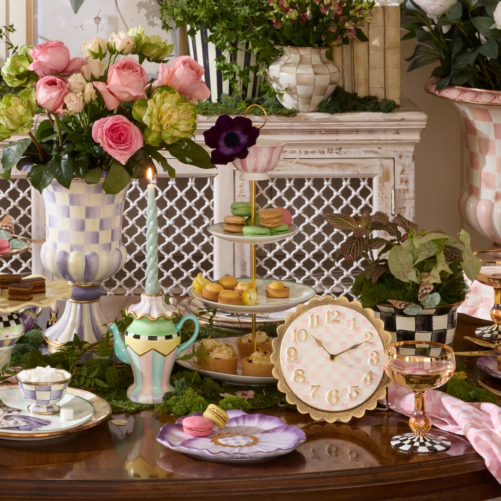 Serve up your favorite sweets with this charming ceramic Wonderland Three Tier Sweet Stand. Features various shades of pastel checks and is topped with a teacup accent.