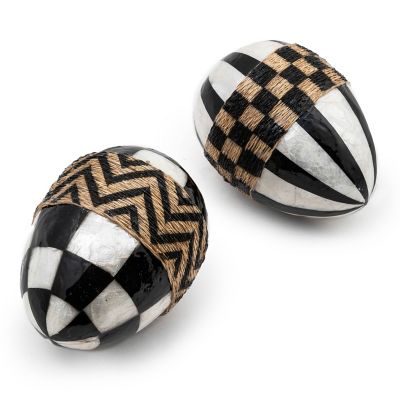 Discover the beauty of natural and neutral with this set of two capiz eggs, featuring hand-painted checks and stripes and accented with patterned jute. They’re presented in a mesh crate.