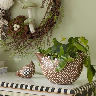 Discover the beauty of natural and neutral with this wood-finish chicken planter decorated with hand-painted carved dots and edged with Courtly Stripe.