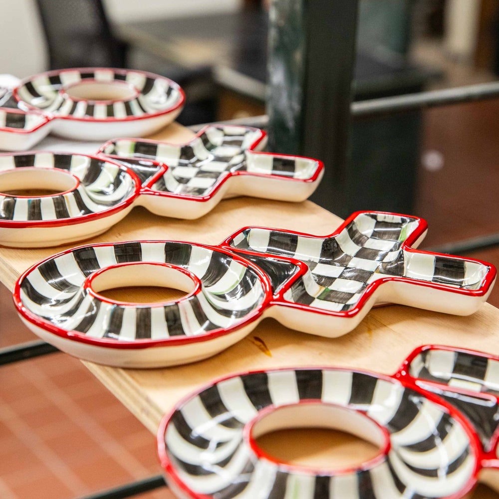 Express your hugs and kisses with the Courtly XO Dish. Made start to finish in Aurora, New York, it features hand-painted Courtly Check® and Courtly Stripe on interlocking X’s and O’s and is perfect for holding treasures or trinkets. Turn it over and you’ll see the marks of the artisans who made it.